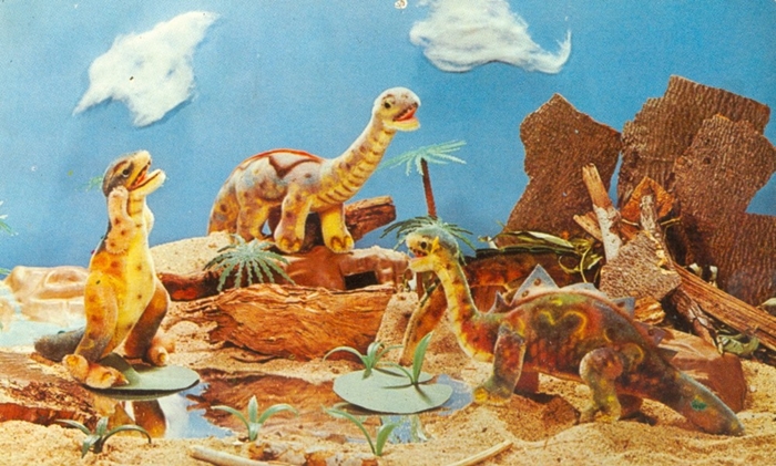 Postcard showing a display of Steiff Zoo Series plush dinosaur toys (1960).