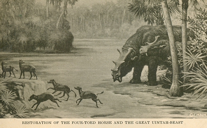 Field Museum souvenir postcard depicting, in black and white, a color mural painted by artist Charles R. Knight for the museum’s Ernest R. Graham Hall, the old “Hall 38.” The lower left portion of this painting shows a herd of the four-toed horse Orohippus. The much larger mammals are Uintatherium. (This postcard is one of a series reproducing Knight’s murals done for the museum.)