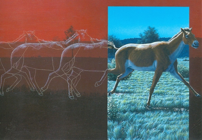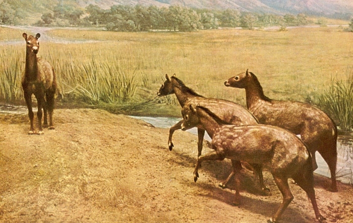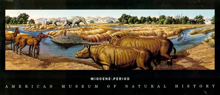 American Museum of Natural History postcard reproducing a Miocene period scene painted by artist Robert J. Barber in 1994. The horse Neohyparian appears at the left.