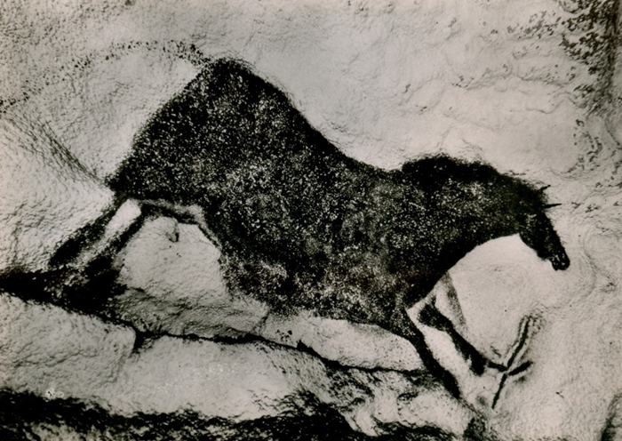 Souvenir postcard (one of a set) from Montignac-sur-Vezere (Dordogne), France, showing a cave painting of an ancient horse, presumably based on a living model.