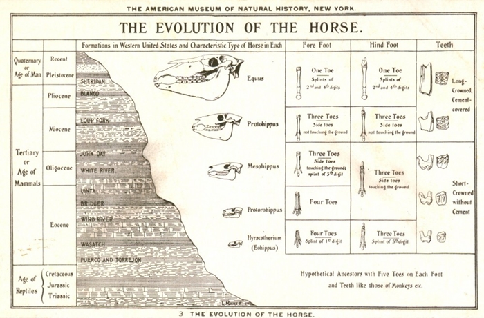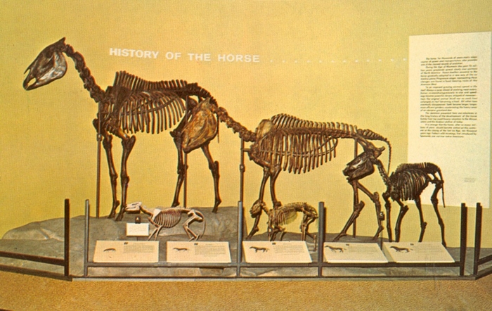 Souvenir postcard from the Carnegie Museum of Natural History showing an exhibit explaining the evolution of the horse over time.