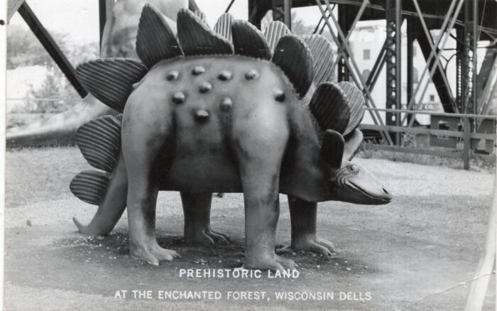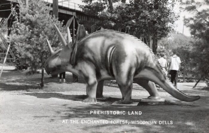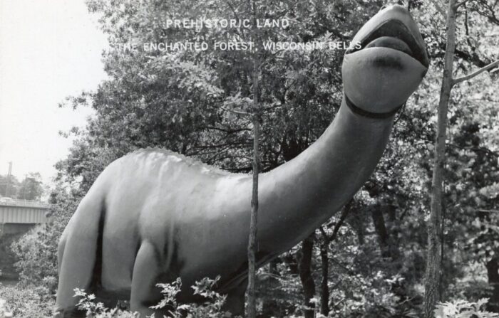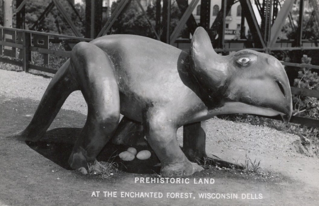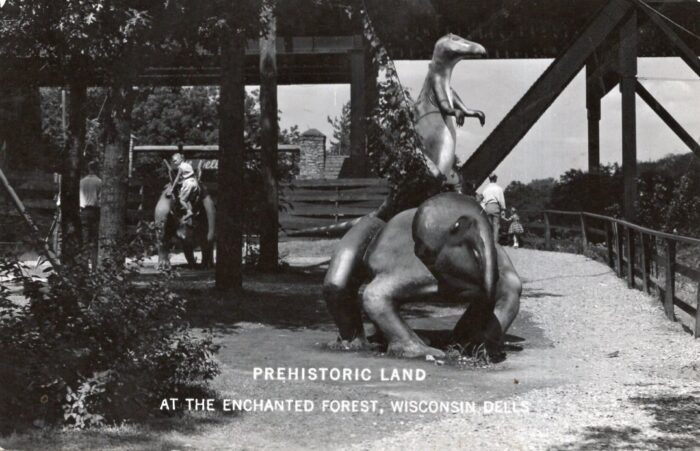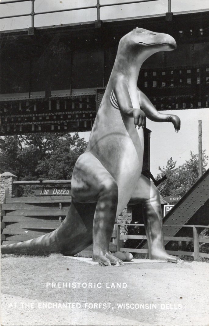 Among the earliest s”prehistoric parks” in the USA was the Prehistoric Land, which was part of the Enchanted Forrest attraction at the Wisconsin Dells. The park began in the mid-1950s featuring a suite of dinosaur figures sculpted by Dick Day, presumably influenced by the ones sculpted by Emmet A. Sullivan for Rapid City’s Dinosaur Park. Alas, Prehistoric Land no longer exists, except in family photos, personal memories and also souvenir postcards like these. To see some snapshots I and my Mom took at Prehistoric Land, CLICK HERE.