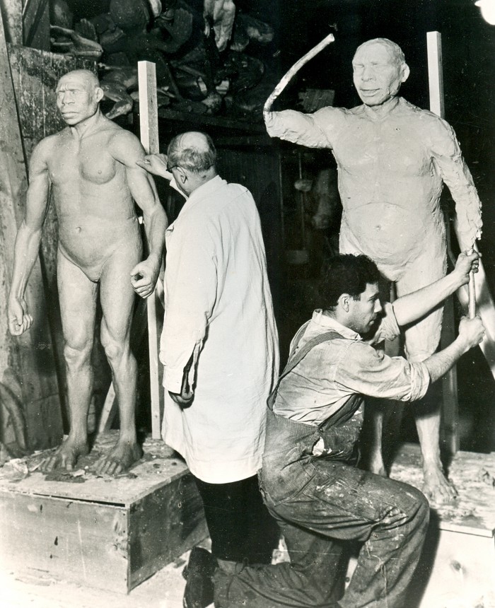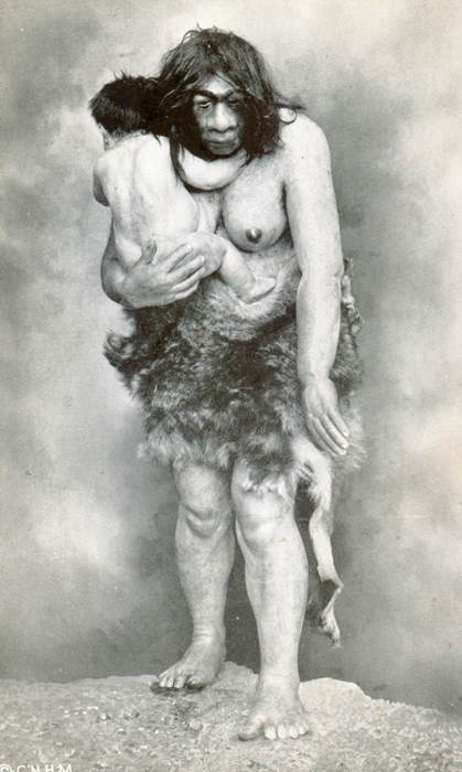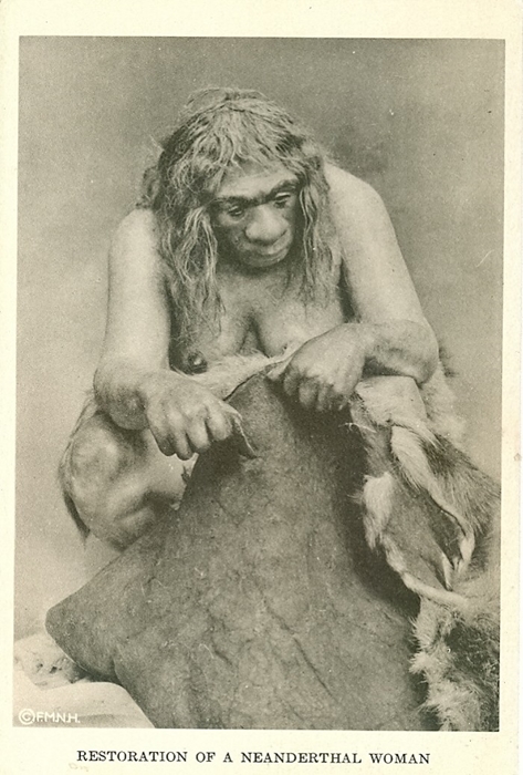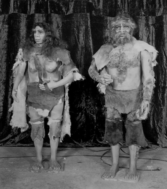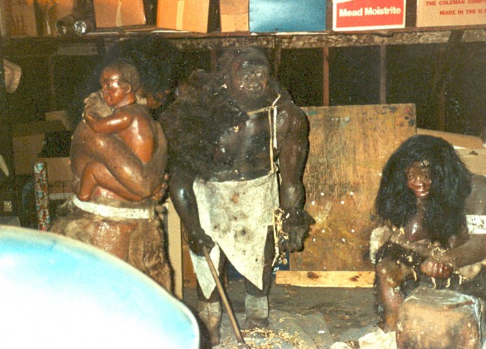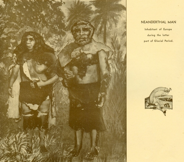 Messmore & Damon’s cave people appear to have been based upon some of the life-sized early-human figures once displayed at Chicago’s Field Museum of Natural History made by Frederick Blaschke in 1933 (the same year as the Chicago World’s Fair, “A Century of Progress”), such as this “Neanderthal Man” shown in a ca. 1930s Keystone Junior Series stereograph (“reverse cross” your eyes to see him in 3D), and “a Neanderthal Woman,” shown in these old souvenir postcards. (To see more postards of these ancient folks — in color — CLICK HERE.)