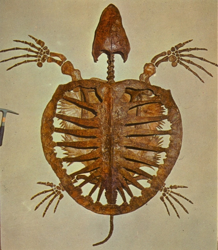 Souvenir postcard from the Denver Museum of Natural History (now the Denver Museum of Nature and Science) showing a skeleton (ventral view) of Protostega gigas.