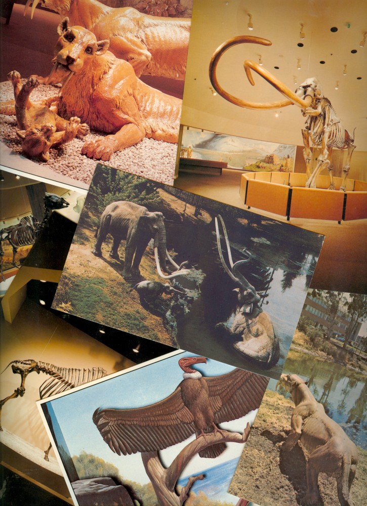 Most of my Rancho La Brea collectibles constitute postcards (see below; and there are lots of them I’m not showing here). The older collectibles — some featuring La Brea mascot Smilodon fatalis, the sabre-toothed cat (and California State Fossil) — were sold at the gift shop at the Natural History Museum of Los Angeles County, the more recent ones at the newer George C. Page Museum of La Brea Discoveries (now referred to as the La Brea Tar Pits and Museum).