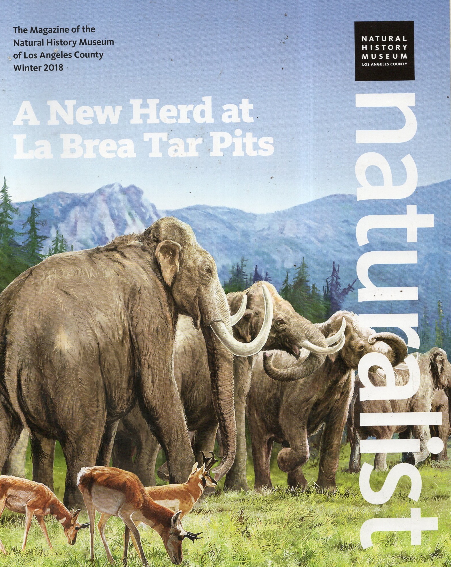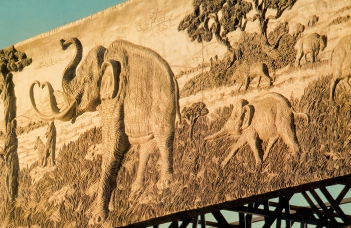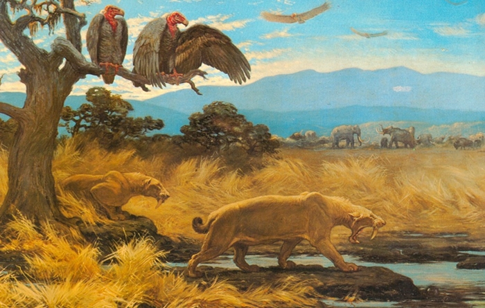 Postcard reproducing the mural, painted in 1926 by artist Charles R. Knight for the Natural History Museum of Los Angeles County, depicting a hypothetical scene of what would one day become Rancho La Brea.
