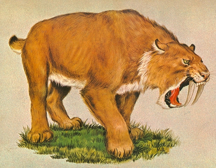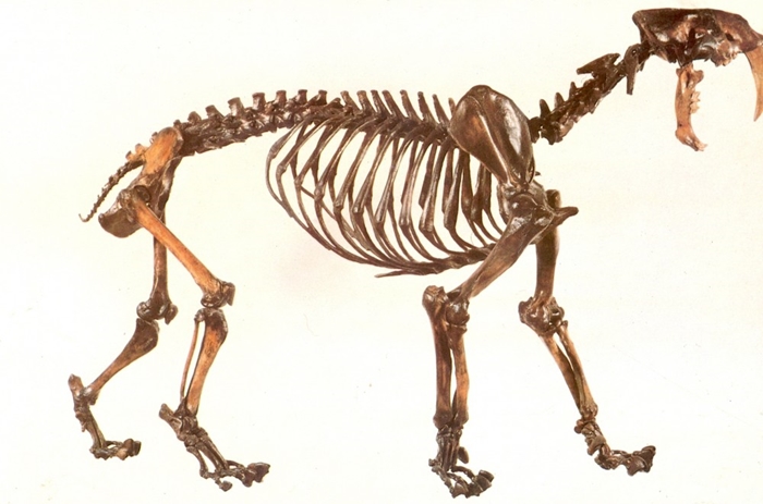 Smilodon fatalis skeleton and life restoration.