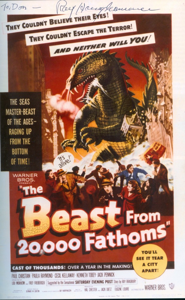 Ray Harryhausen has signed many items for me, including this “behind the scenes” photo from his movie The Valley of Gwangi — a film (released in 1969, models sculpted by Arthur Hayward)’