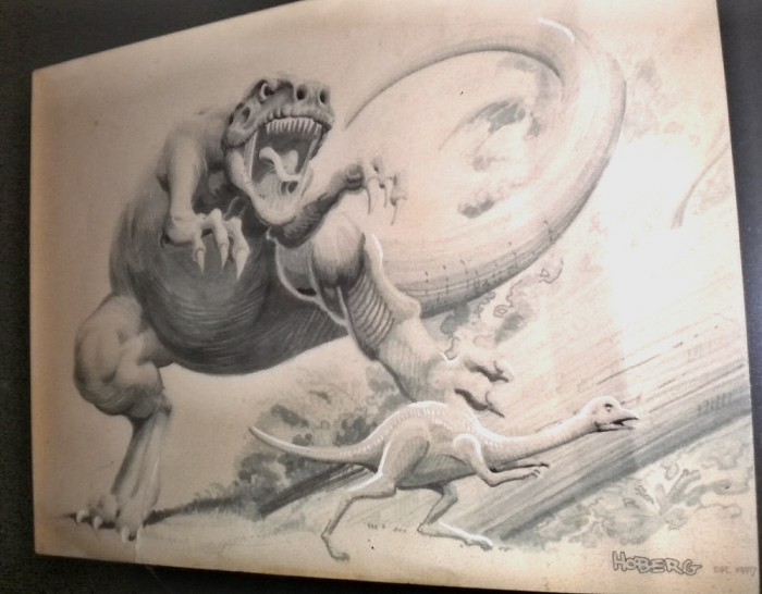 Drawing by Rick Hoberg of Chilantaisaurus stalking Archaeornithomimus prepared for my book The New Dinosaur Dictionary (1982).