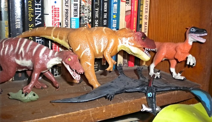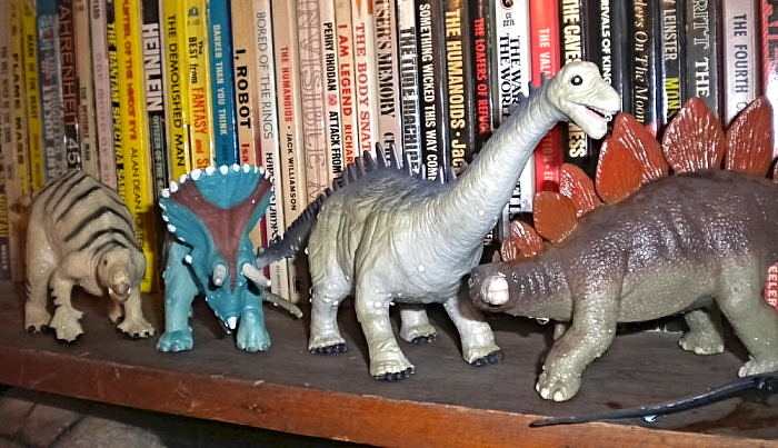 On a bookcase self, prehistoric-animal figures from R&M (2004), manufactured in China.