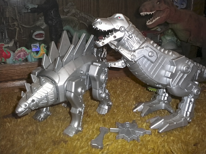 Plastic toy robot Tyrannosaurus and Stegosaurus from Manley, Los Angeles (made in China during the 2000s).