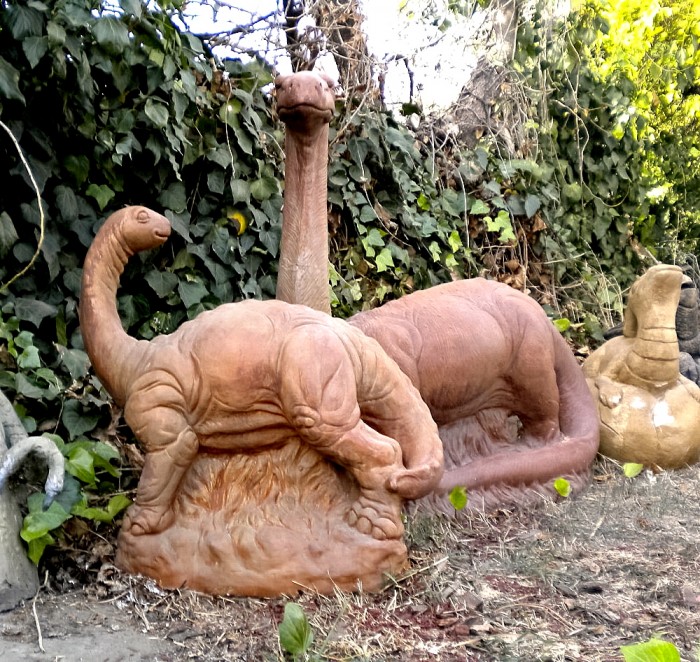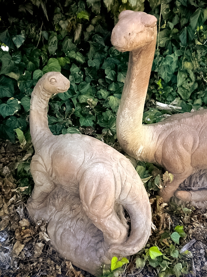 Adult and juvenile sauropod dinosaur garden statues made of cement.