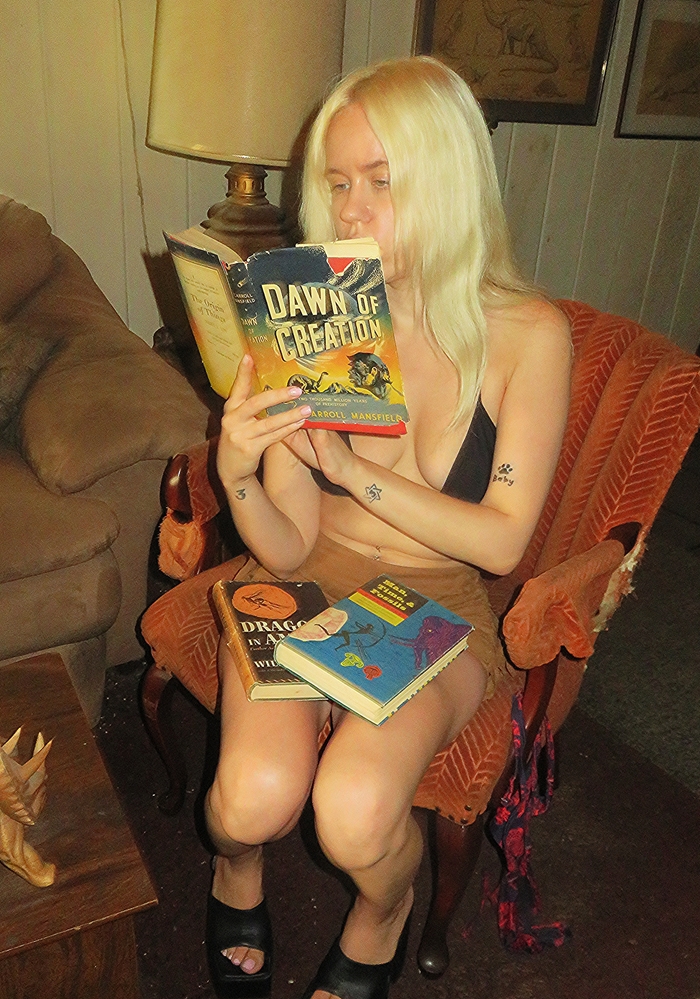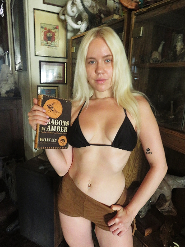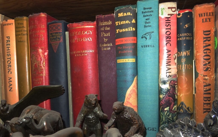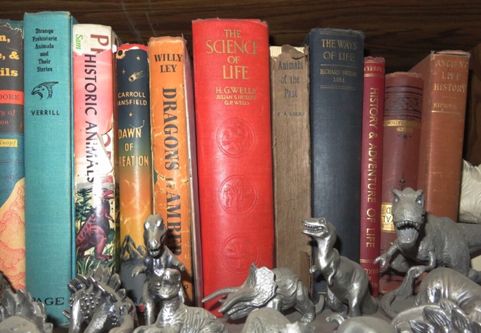 Shelf with some older books about dinosaurs and other kinds of prehistoric creatures.