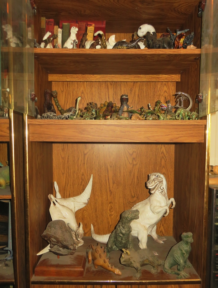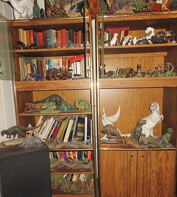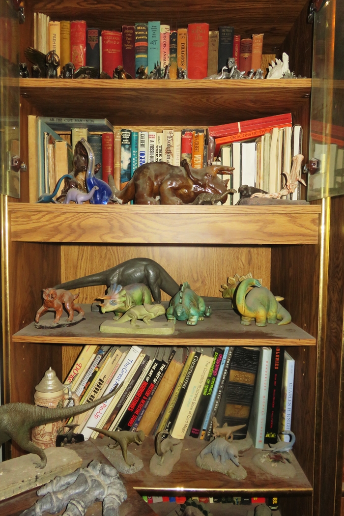 These shelves contain the majority of small prehistoric collectibles in the living room.