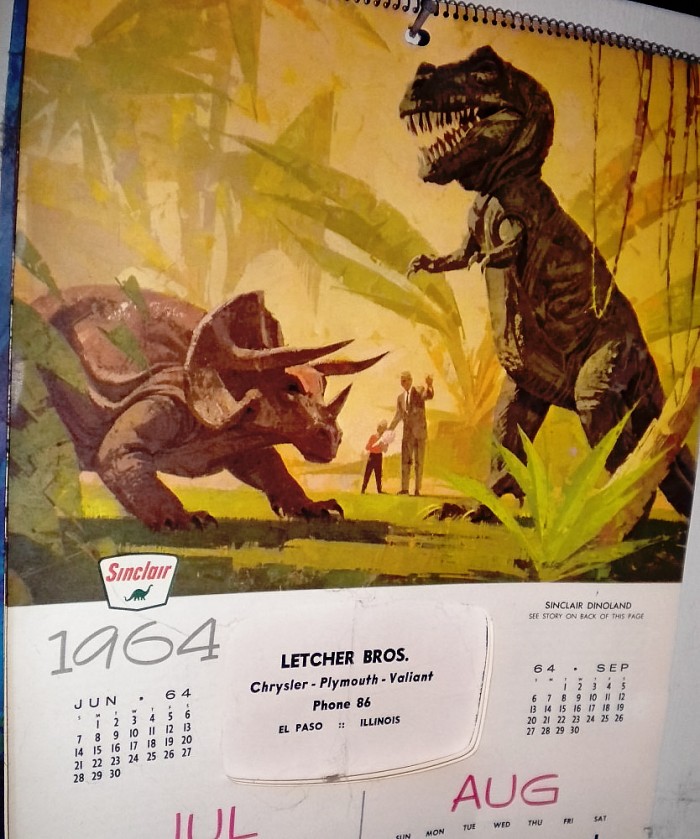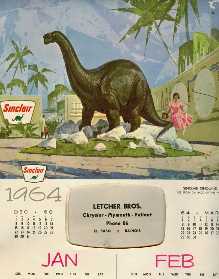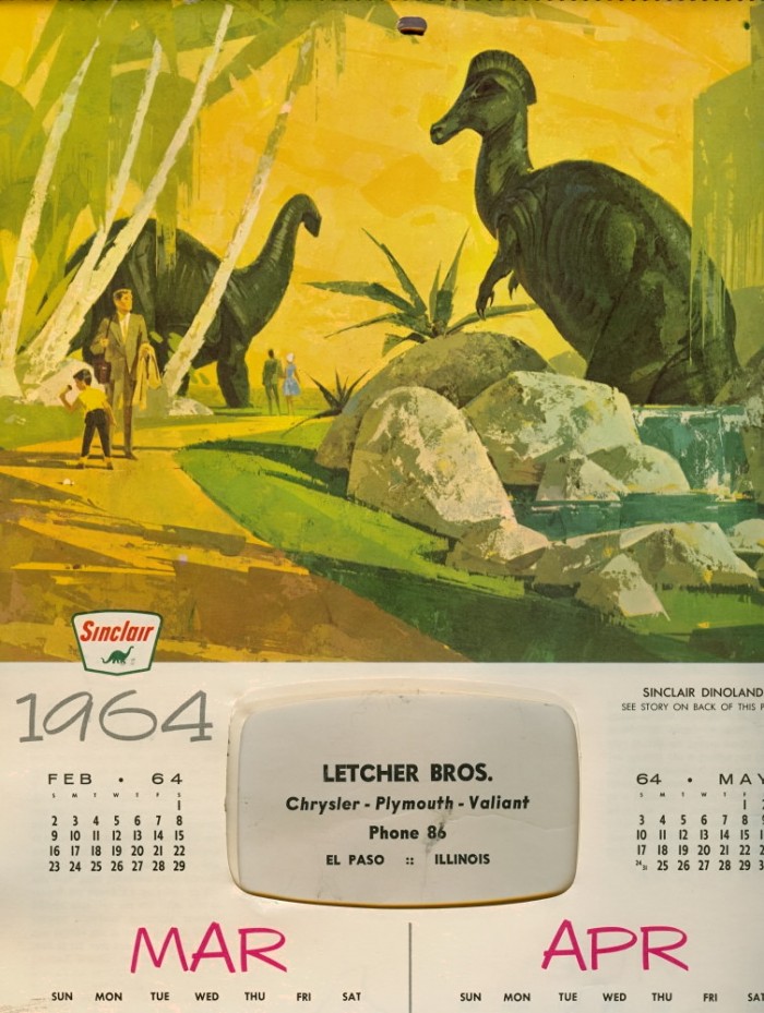 Give-away calendar promoting the 1964 New York World’s Fair, including Sinclair’s “Dinoland” exhibt of live-sized dinosaur figures (left and below).