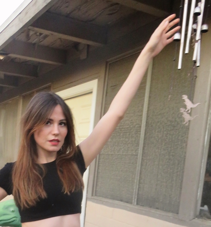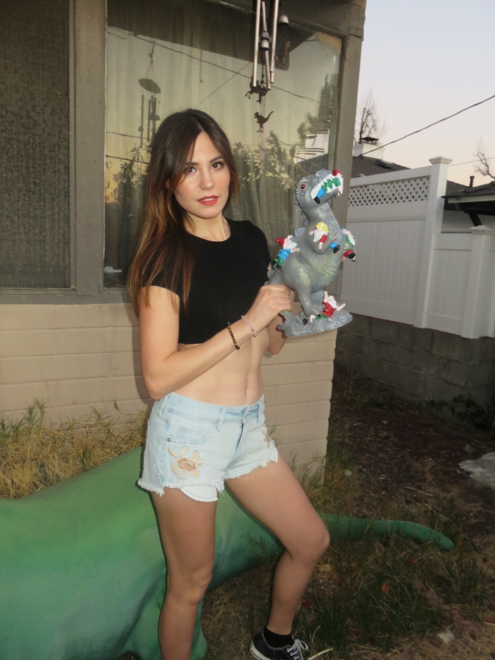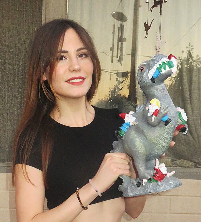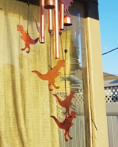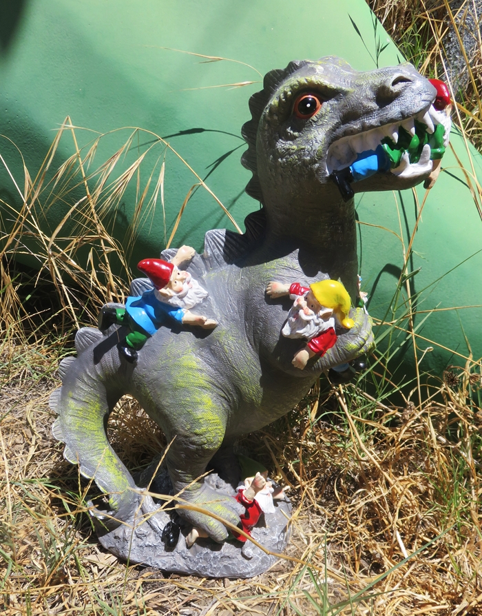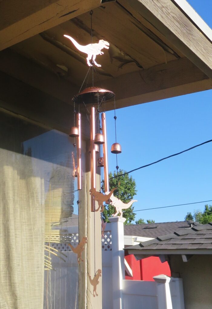 At the beginning of my “Dinosaur Park,” wind chimes and a hungry Dinosaur Gnomes Garden Statue.