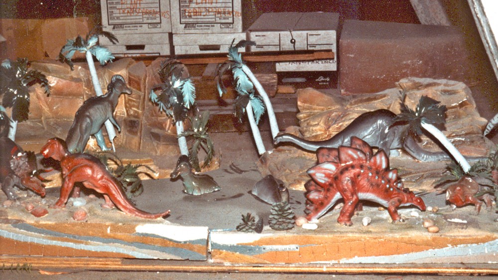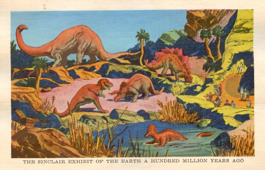 This approximately 4′ x 8′ diorama had been tucked away in storage up in the rafters of the Chicago Academy of Science since 1934, following the closing of the 1933-4 Chicago World’s Fair, “A Century of Progress.” The diorama is a miniature version of the outdoor “Sinclair Dinosaur Exhibit,” which had been a popular (and free-admission) attraction at the Fair. The diorama was made of plaster and comprised, as I recall, four component pieces that fit together like a jigsaw puzzle.