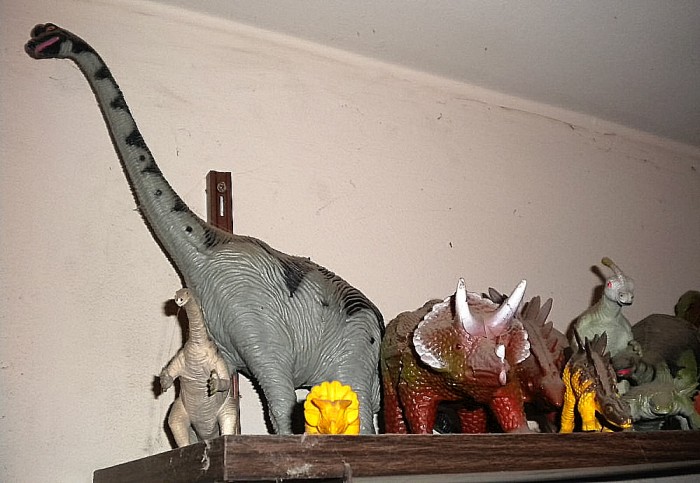 Above the bedroom door, Smithsonian Institution (and other) prehistoric figures based on those made by Invicta Plastics for the British Museum (Natural History); also, various other prehistoric figures.