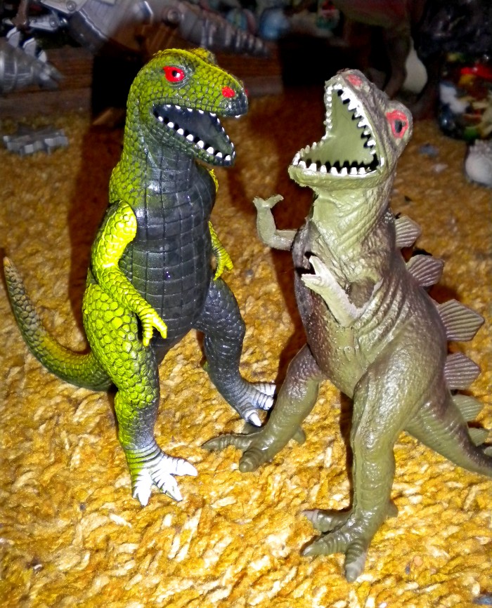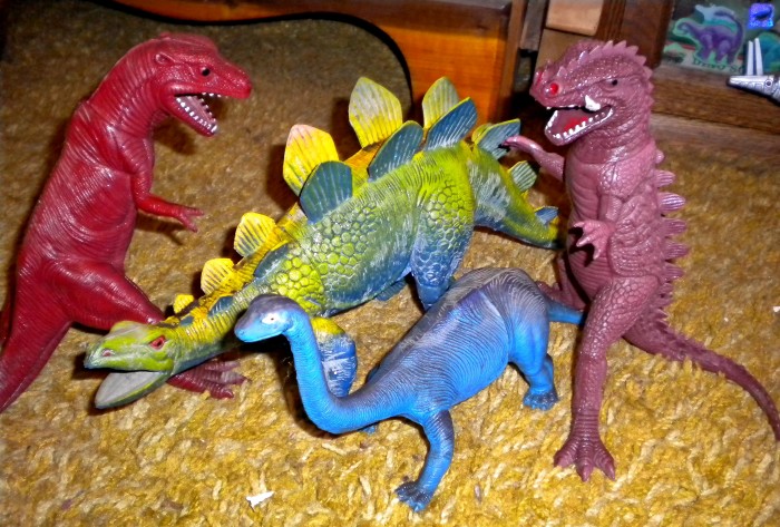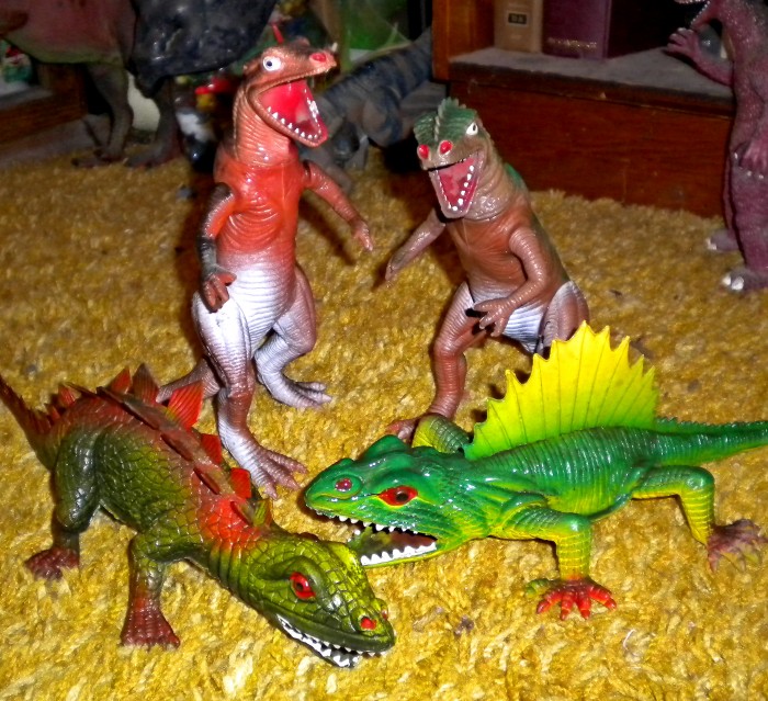 Inexpensive vinyl and plastic prehistoric figures — all presumably made somewhere in China and/or other parts of Asia — are scattered all over the house.