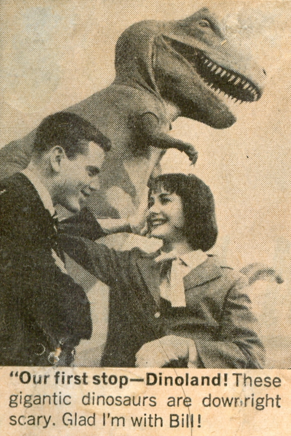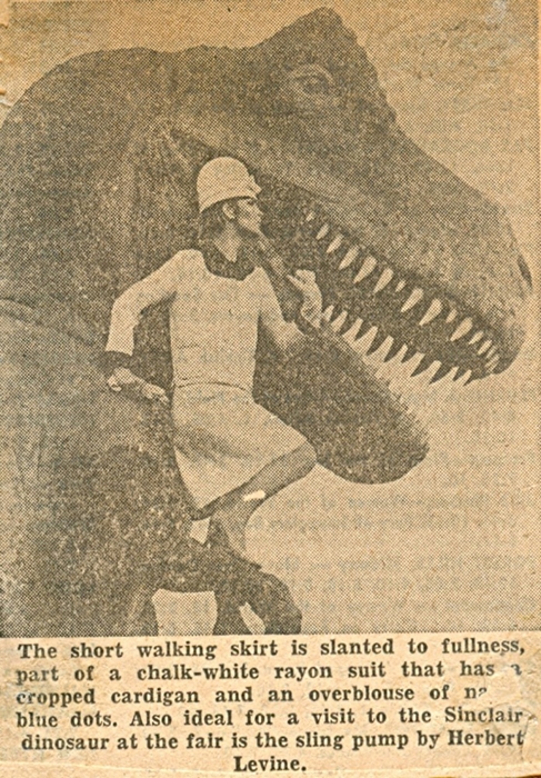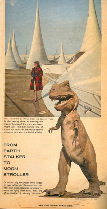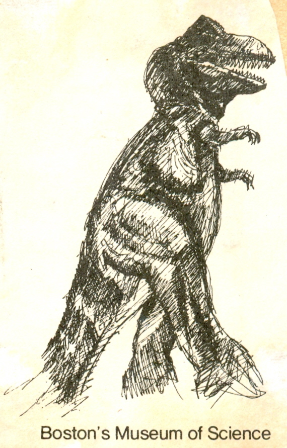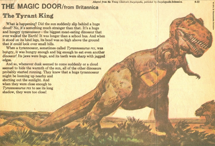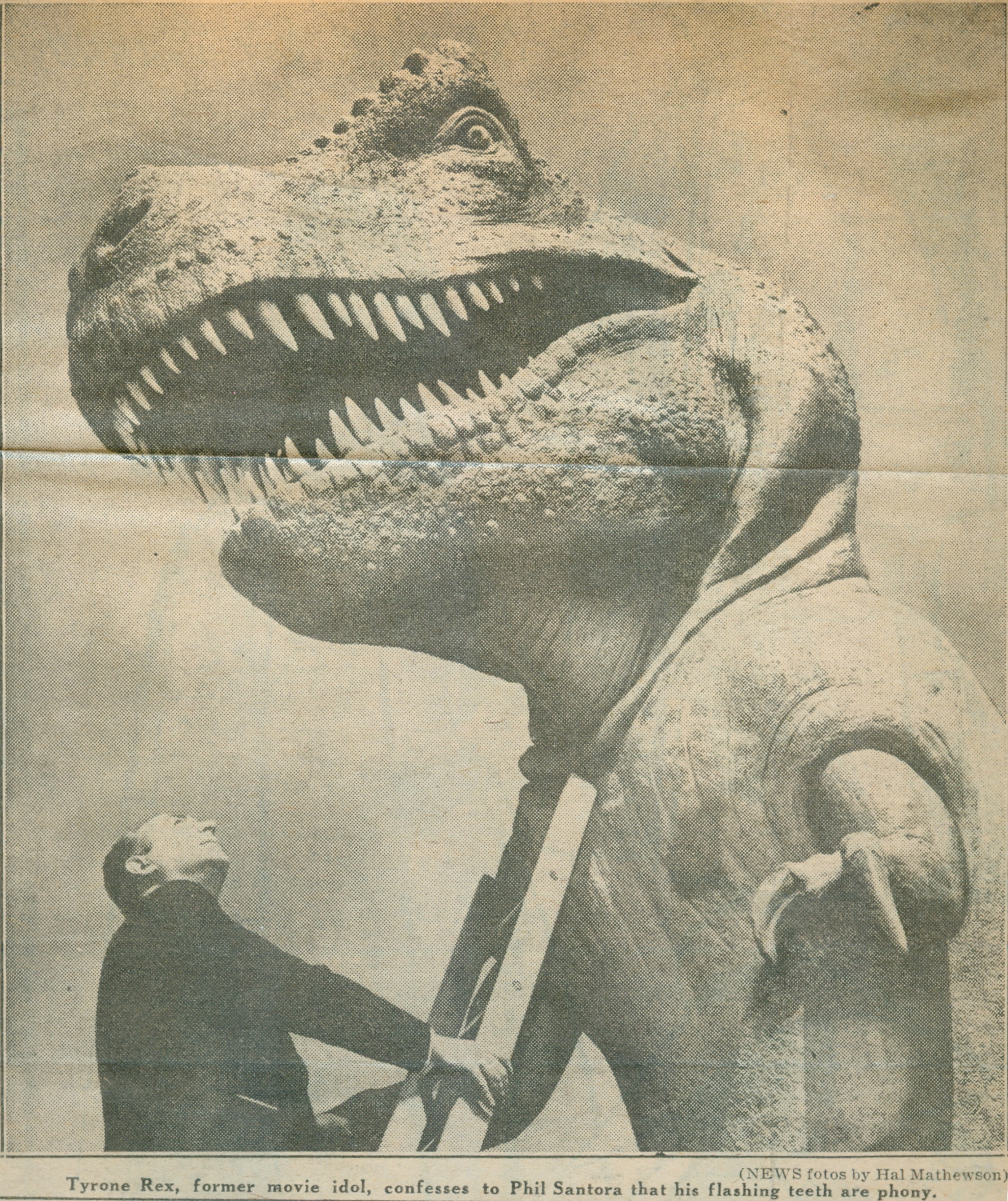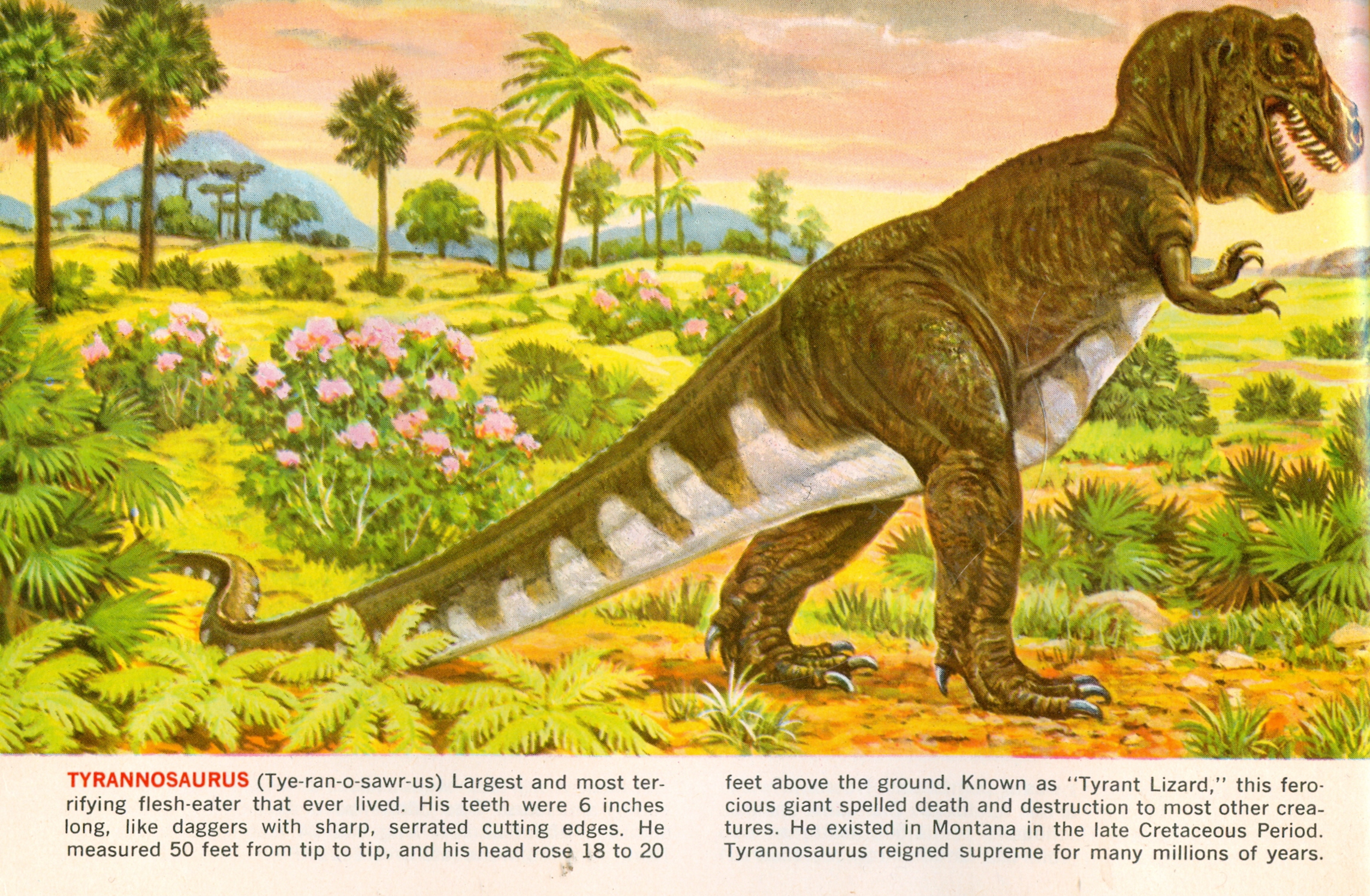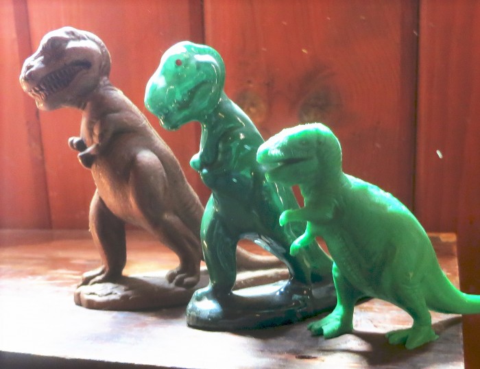 For a number of years, the original Jonas Studios Tyrannosaurus continued to appear, in one form or another (often as the basis for a new depiction), as collectible book, booklet, magazine and newspaper illustrations, comic-book art, postcards, advertisements, etc., also (directly below, from left to right) as a hollow “blow molder” injected-plastic figure sold in “Mold-a-Rama” vending machines, a wax candle and a green plastic toy (all along with others based on the Jonas dinosaur models).