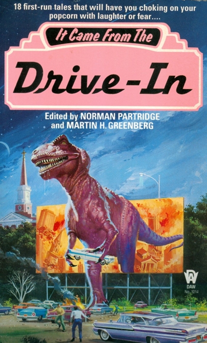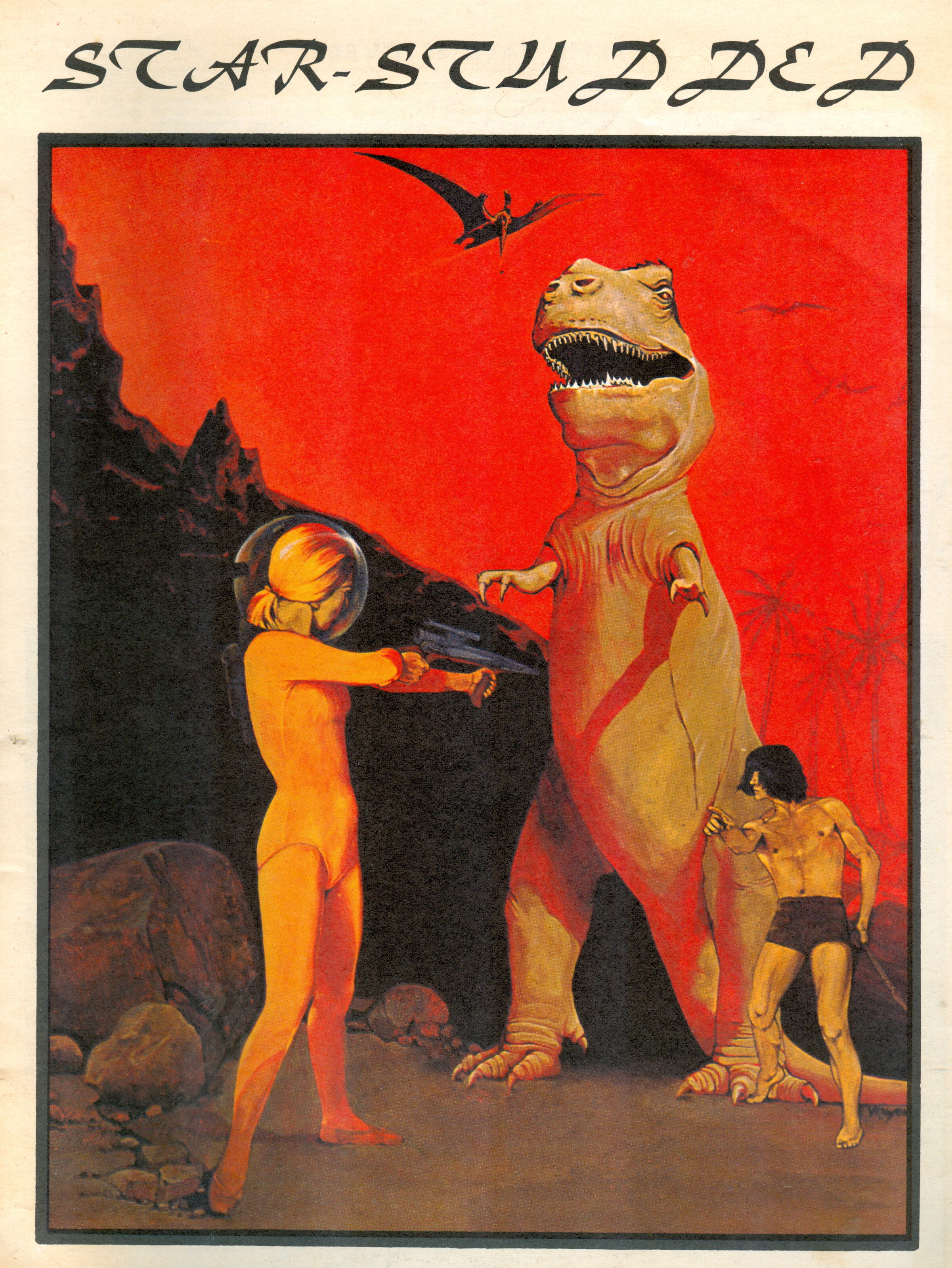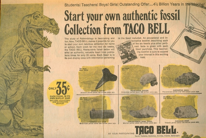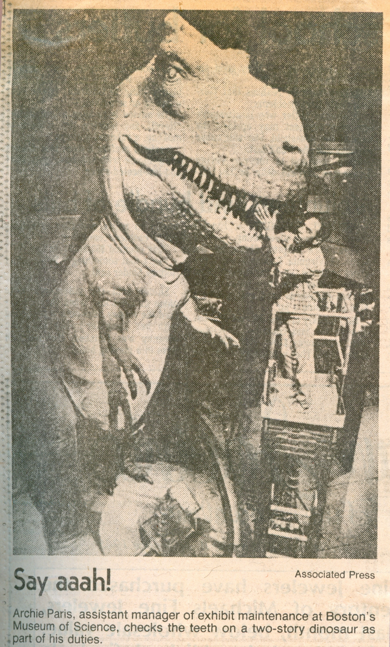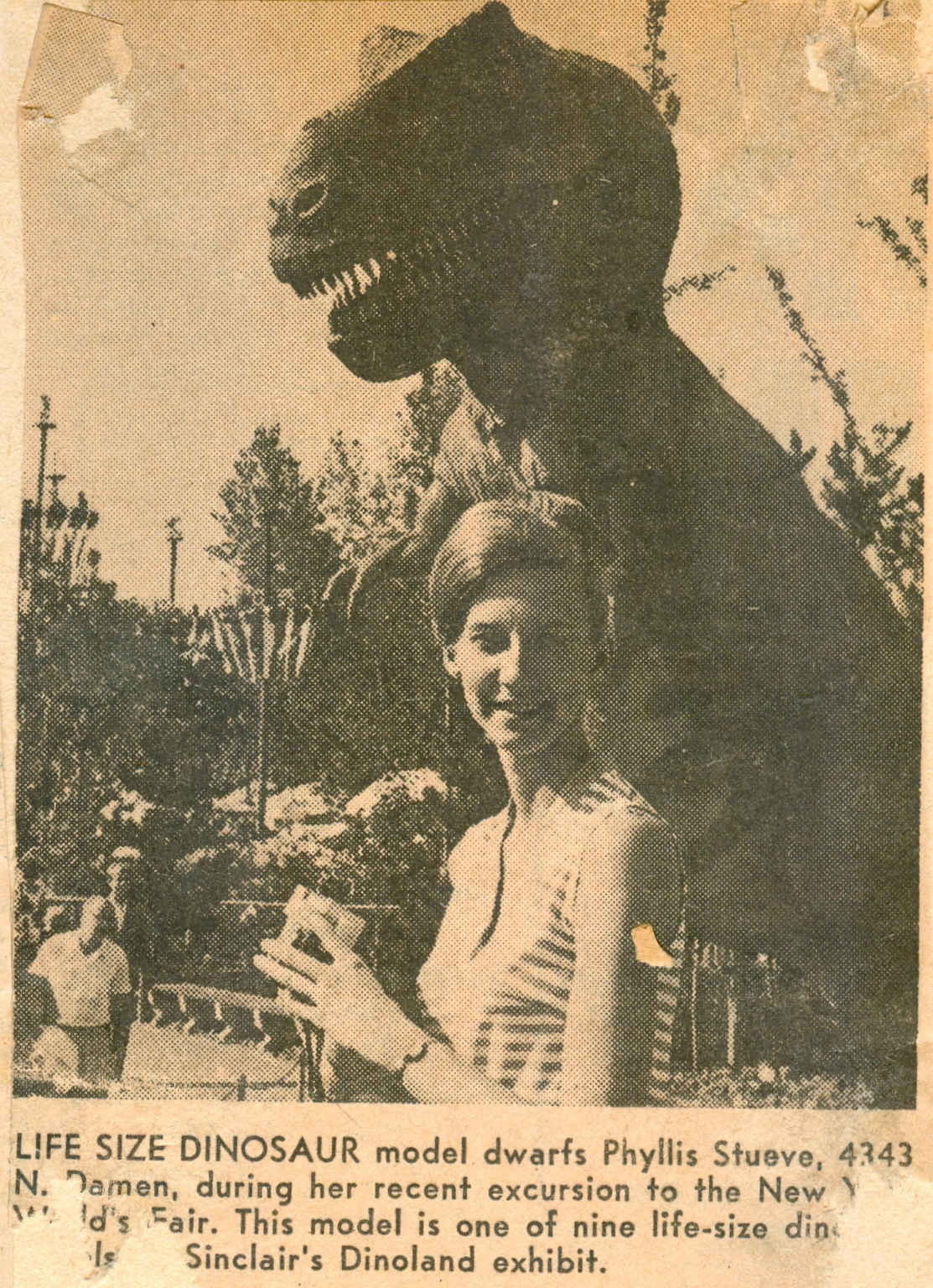 For a number of years, the original Jonas Studios Tyrannosaurus continued to appear, in one form or another (often as the basis for a new depiction), as collectible book, booklet, magazine and newspaper illustrations, comic-book art, postcards, advertisements, etc., also (directly below, from left to right) as a hollow “blow molder” injected-plastic figure sold in “Mold-a-Rama” vending machines, a wax candle and a green plastic toy (all along with others based on the Jonas dinosaur models).