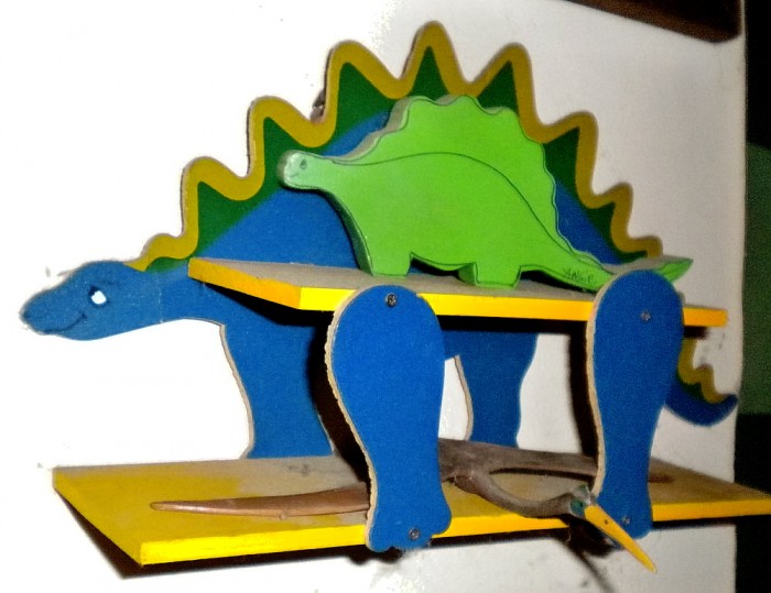 Wooden Stegosaurus mini-shelf supporting a small wooden Stegosaurus.
