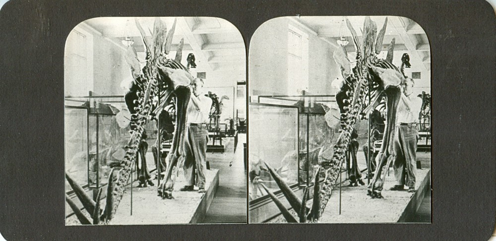 Stereographs showing views of Stegosaurus: first, a view taken during the early 20th Century of the Stegosaurus skeleton at the American Museum of Natural History; second, the Smithsonian Institution’s papier mache life-sized, fleshed-out figure as it appeared in the United States Government exhibit at the World’s Fair, St. Louis (Underwood & Underwood, 1904. To see these images in 3D, just “reverse cross” your eyes.