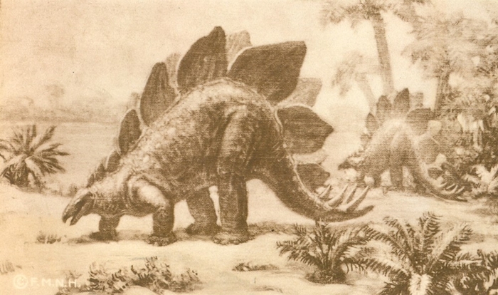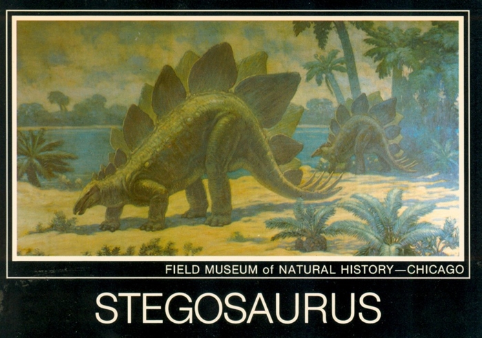 Postcards from The Field Museum, the first a black and white reproduction of Charles R. Knight’s small preliminary color “cartoon” of Stegosaurus, the other the finished mural that he painted for the museum during the latter 1920s.