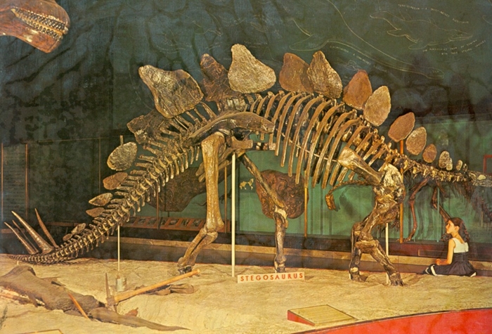 American Museum of Natural History souvenir postcard showing its mounted Stegosaurus skeleton.