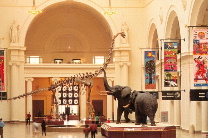 Souvenir postcard from The Field Museum showing a mounted skeleton (cast) of Brachiosaurus altithorax. The mount includes casts of the original bones upon which this dinosaur was based, collected by Elmer J. Riggs at Grand Junction at the beginning of the 20th century.