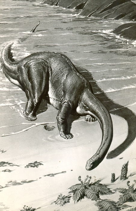 Souvenir postcard from the British Museum (Natural History), now The Natural History Museum, London, showing artist Neave Parker’s life restoration of Apatosaurus, a sauropod closely related to Supersaurus.