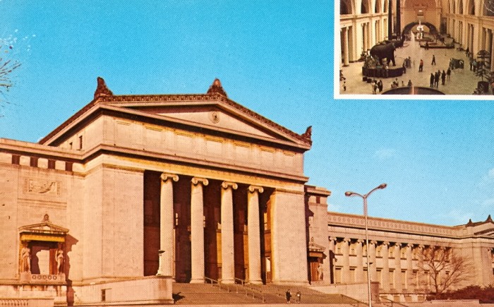 My Mother first took me to the Chicago Natural History Museum (now The Field Museum, see souvenir postcard, far left) when I was just in kindergarten — an experience, when I saw those giant ancient skeletons, that would have a profound impact upon my life (and career). These two photos show the old gallery of vertebrate fossils (Hall 38) as it looked when I first began to visit the museum. After a while (in my fifth and sixth grade) I make the trip on a weekly basis.