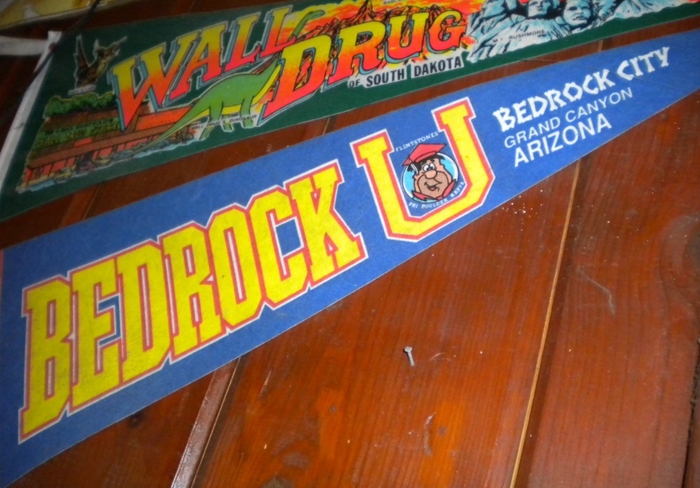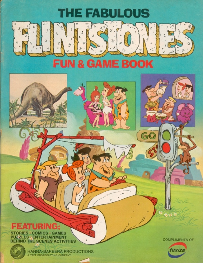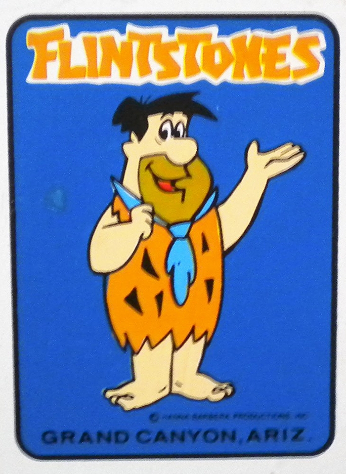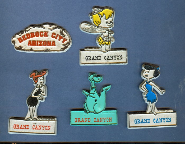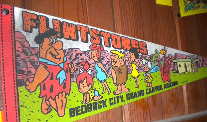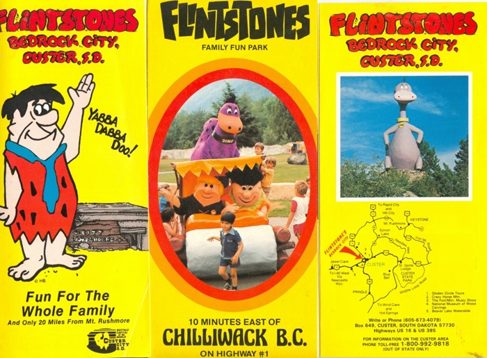 Many Flintstones-related items can be purchased at the gift shops in a number of “Flintstones Bedrock City” attractions located in parts of the USA and Canada. You get an idea of what they’re like from these pennants, postcards and brochures.