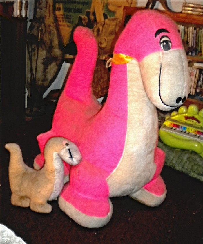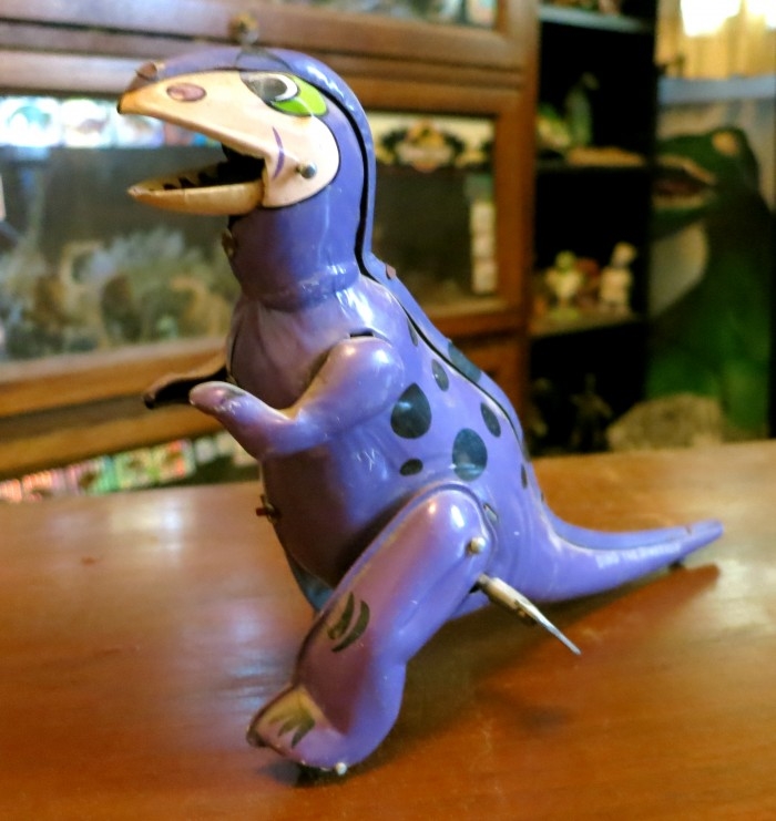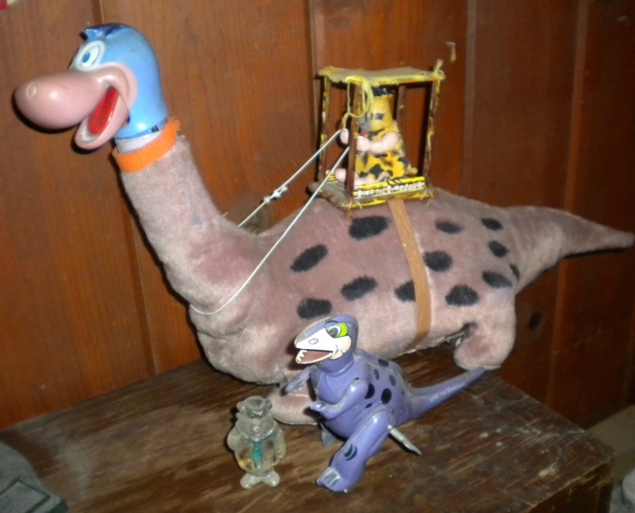 Based on The Flintstones TV cartoon character, “Dino” the dinosaur wind-up walking toy, from Line Mar Toys, Japan. There were also “Dino” plush toys, View-Master sets, both large and small, comic books and other items, all now quite collectible.