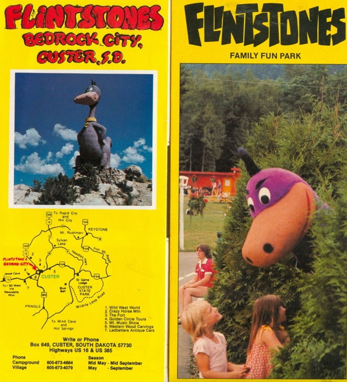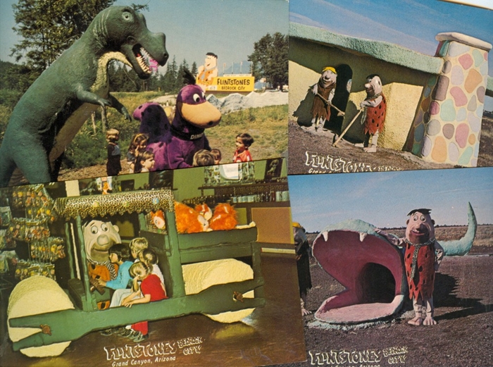Souvenir postcards (below, left) from the Custer “Flinstones Bedrock City.”