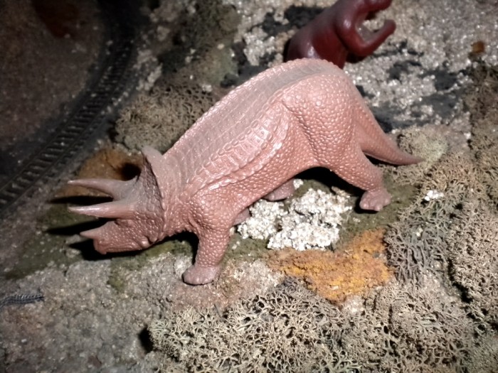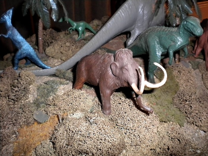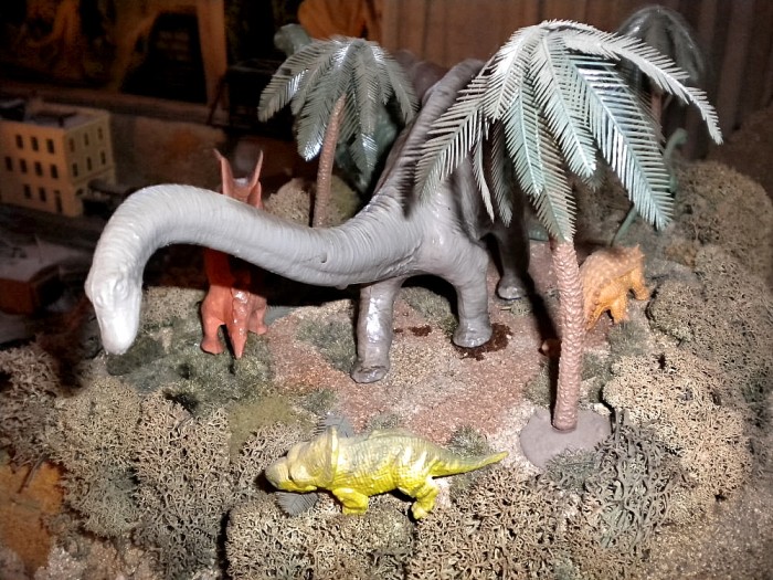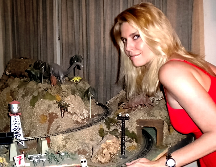 HO scale electric train layout with its own plateau-top “Lost World,” complete with prehistoric animals, an active volcano and tar pit (with actual La Btra asphalt). The trains ran through time for three decades — before going extinct. Alas, more in need of space than a model railroad, I finally dismantled the layout.