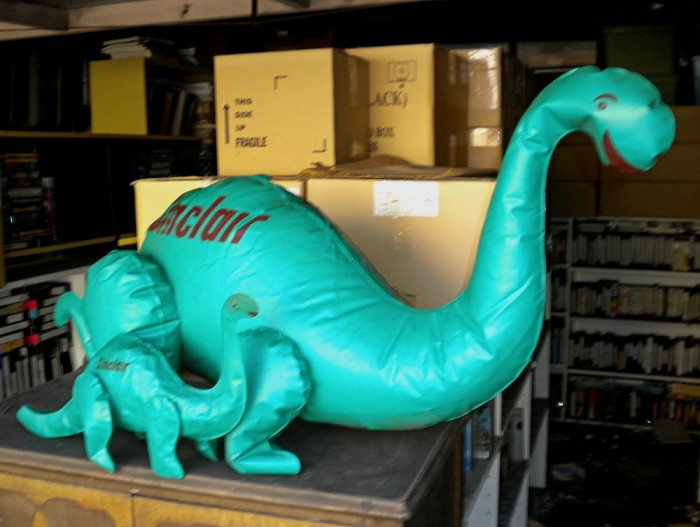 Inside the garage — in addition to myriad publications, etc. relating to prehistory — these Sinclair Oil Co. “Dino” inflatables from the 1960s.