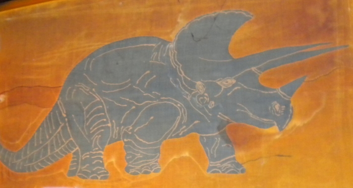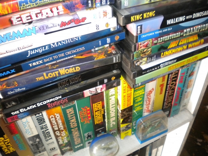 Below, “Horacio” collectibles from Brazil (1980s?), filing cabinets with dinosaur stickers, lots of DVDs and videos (here’s a small sample) and a hand-stitched Triceratops