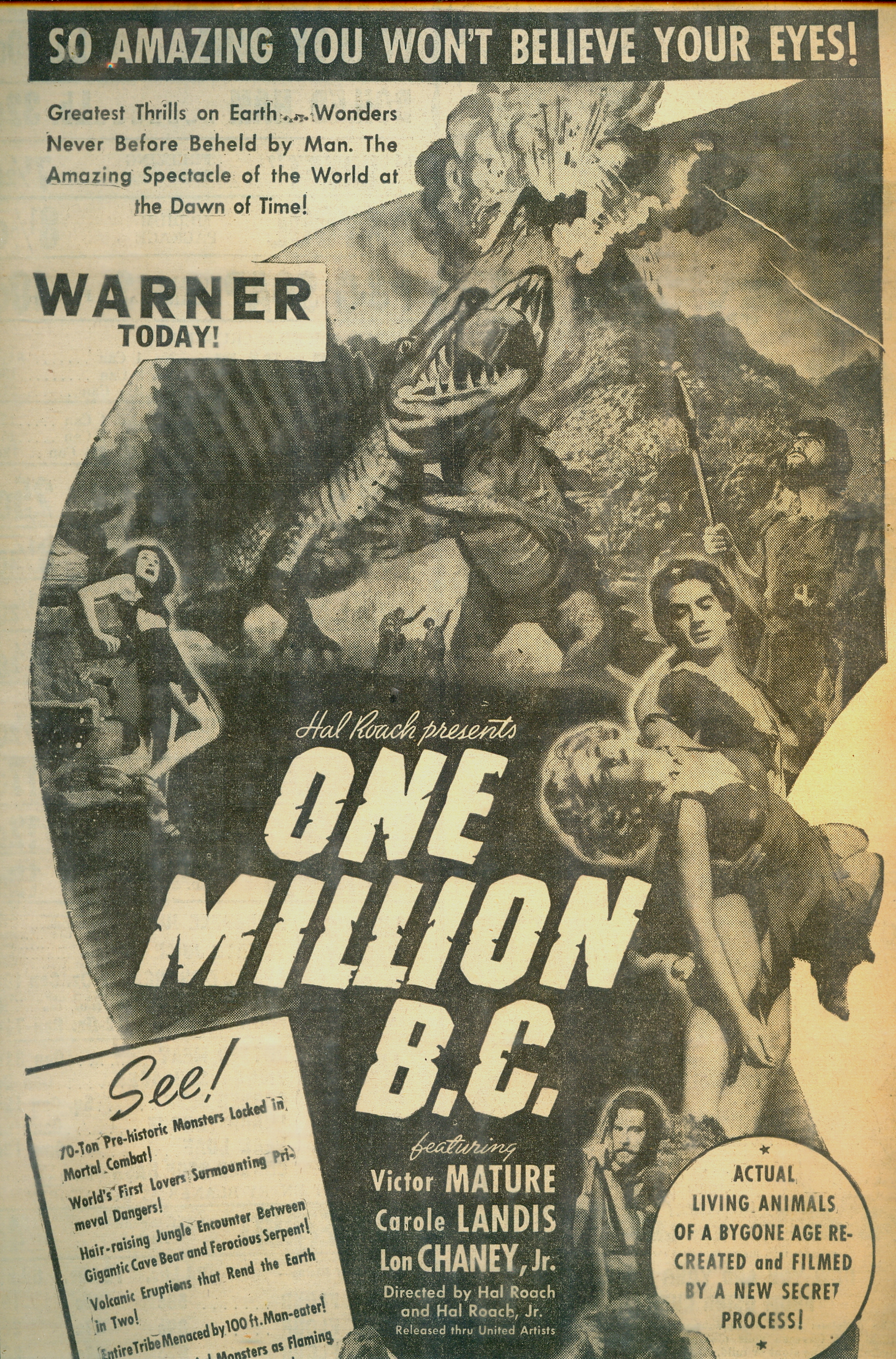 Belgian poster (left)from the 1940 Hal Roach motion picture One Million B.C. Below, a vintage newspaper advertisement for the movie.