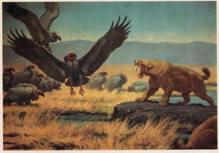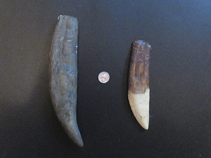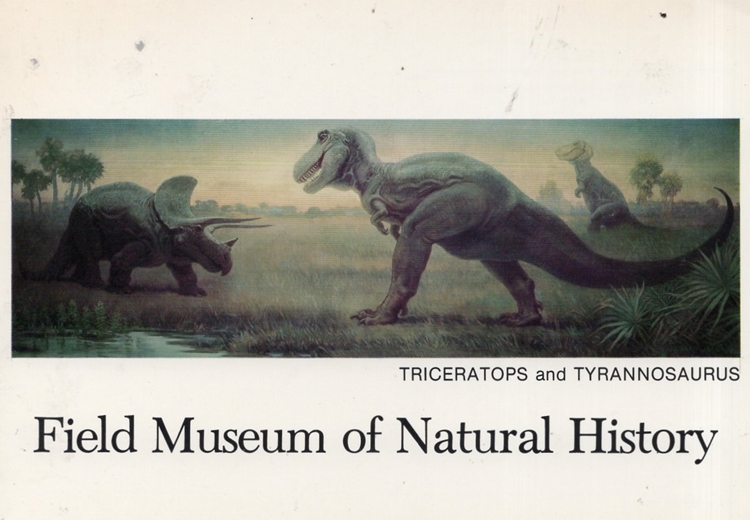 Teeth (casts) of two carnivorous prehistoric animals separated by tens of millions of years — the dinosaur Tyrannosaurus rex and cat Smilodon fatalis — from Valley Anatomical Preparations, Canoga Park, California. Below, souvenir postcards featuring Smilodon and Tyrannosaurus reproducing paintings by artist Charles R. Knight, from The Field Museum, Chicago, Illinois.