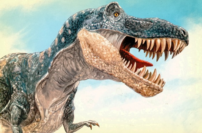 DinoCardz postcard (1992) reproducing a painting of Tyrannosaurus by artist Dave Marrs.
