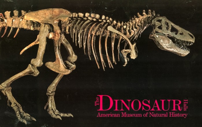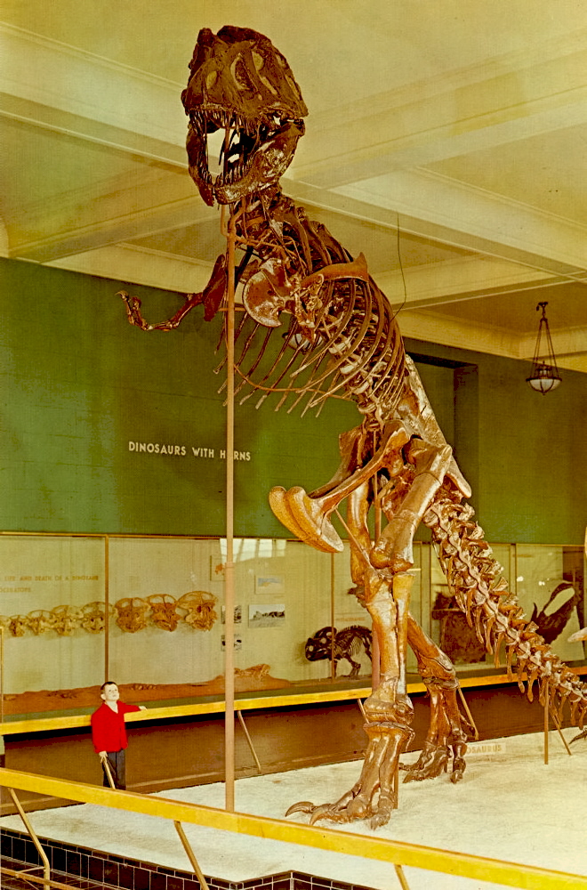 Souvenir postcard from the American Museum of Natural History showing the museum’s T. rex skeleton as mounted with its original (and incorrect) vertical posture.