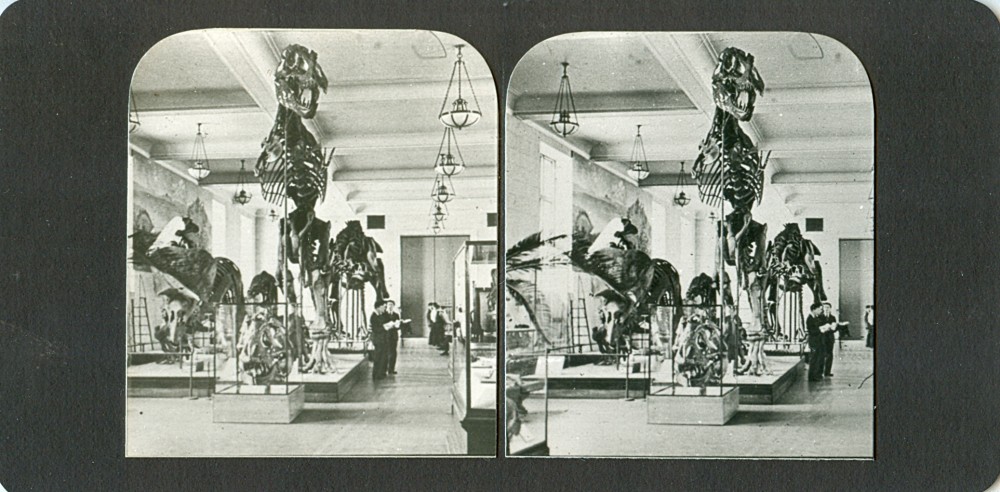 Stereopticon view taken during the early 20th Century of a Tyrannosaurus rex skeleton mounted at the American Museum of Natural History. (To see this image in 3D, “reverse cross” your eyes.)