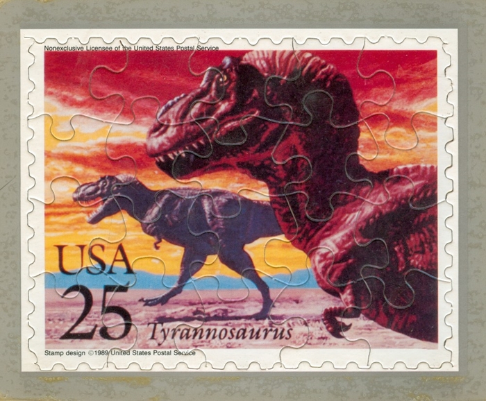 Jigsaw puzzle postcard from the Field Museum, reproducing the image of Tyrannosaurus as depicted on a U.S. postage stamp.