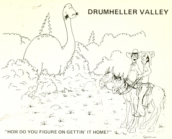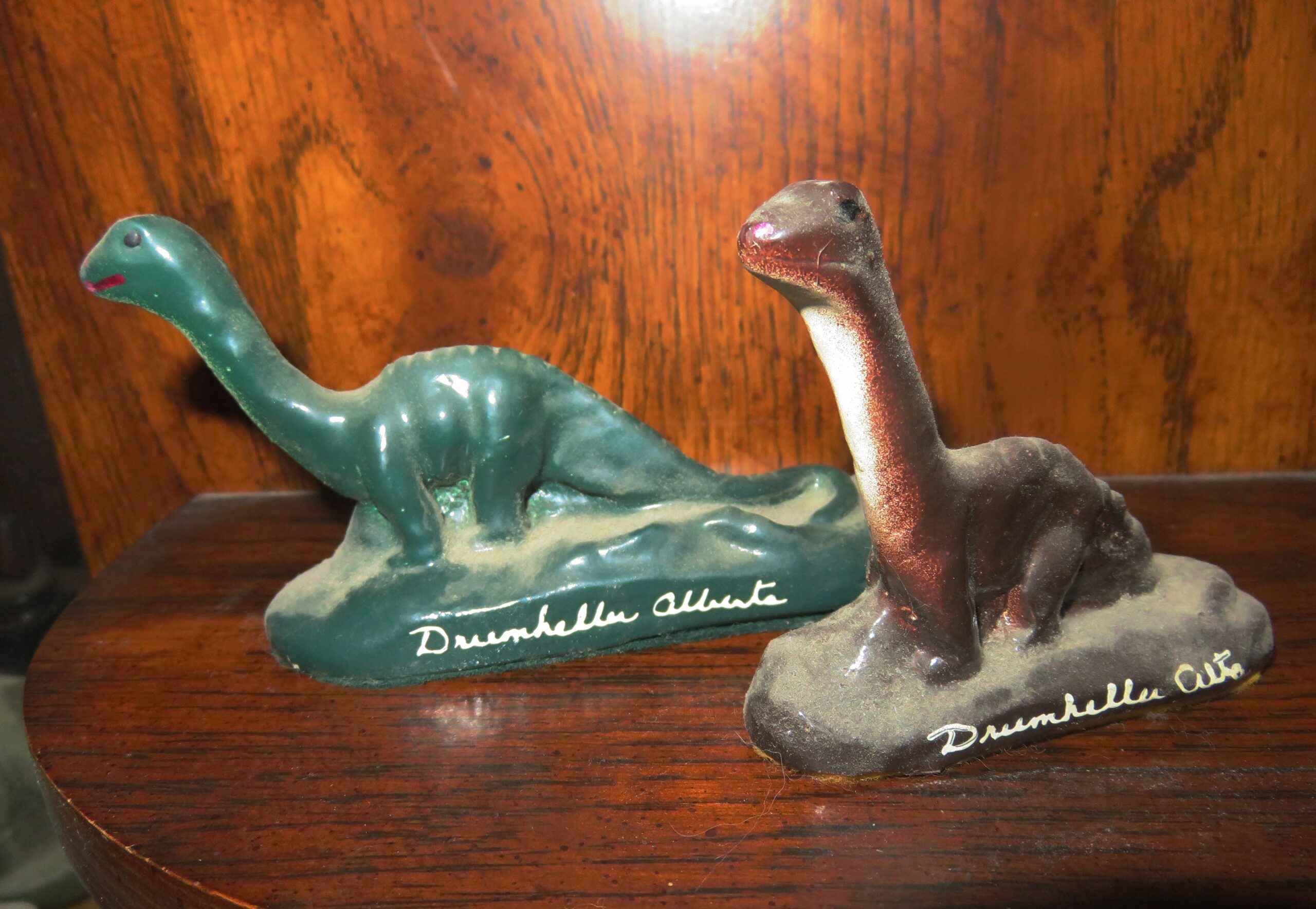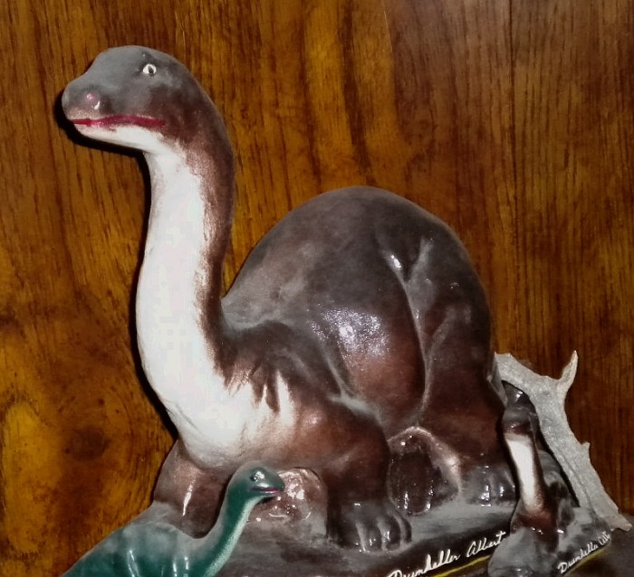 Apatosaurus plaster dinosaur model, made by Esther Vickers and Gail Hanneuse, sold in various stores in Drumheller, Alberta, Canada.
