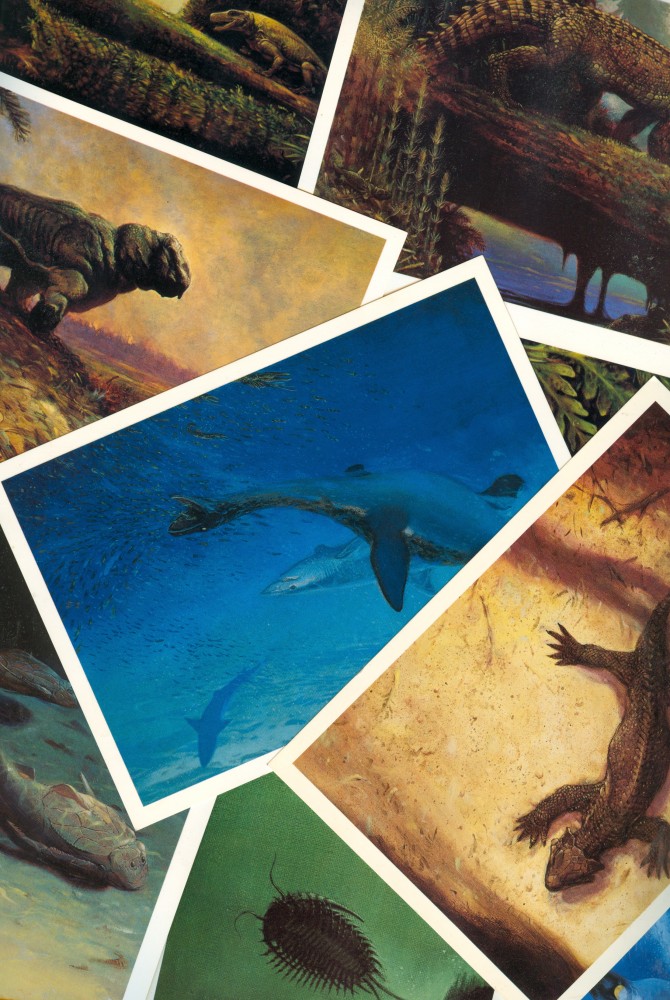 Montage of postcards from “Dinosaurs, Penguins and Whales” — William Stout’s Antarctica” show.