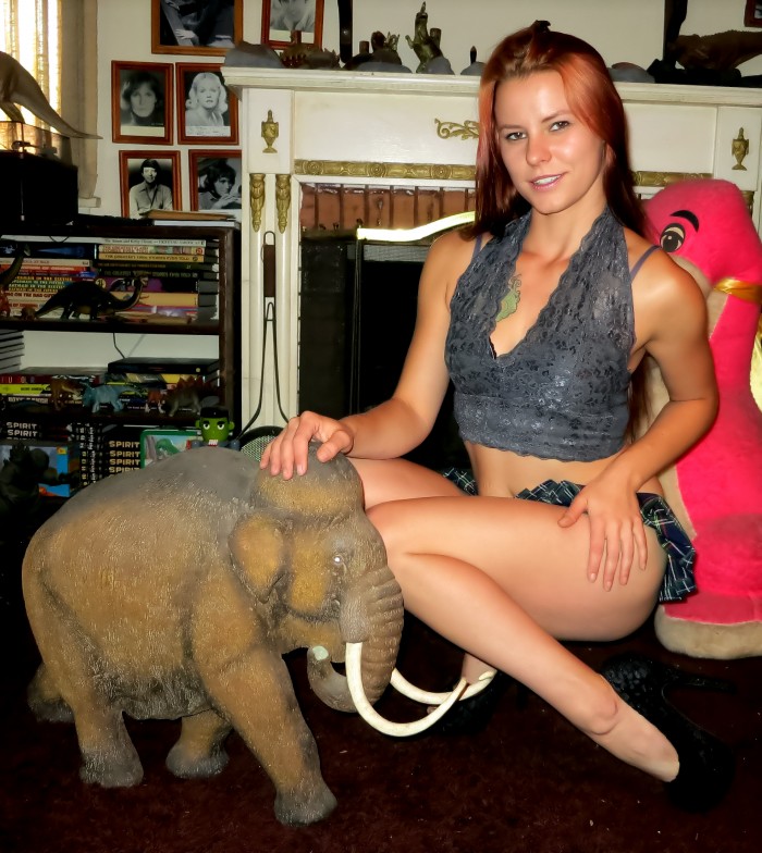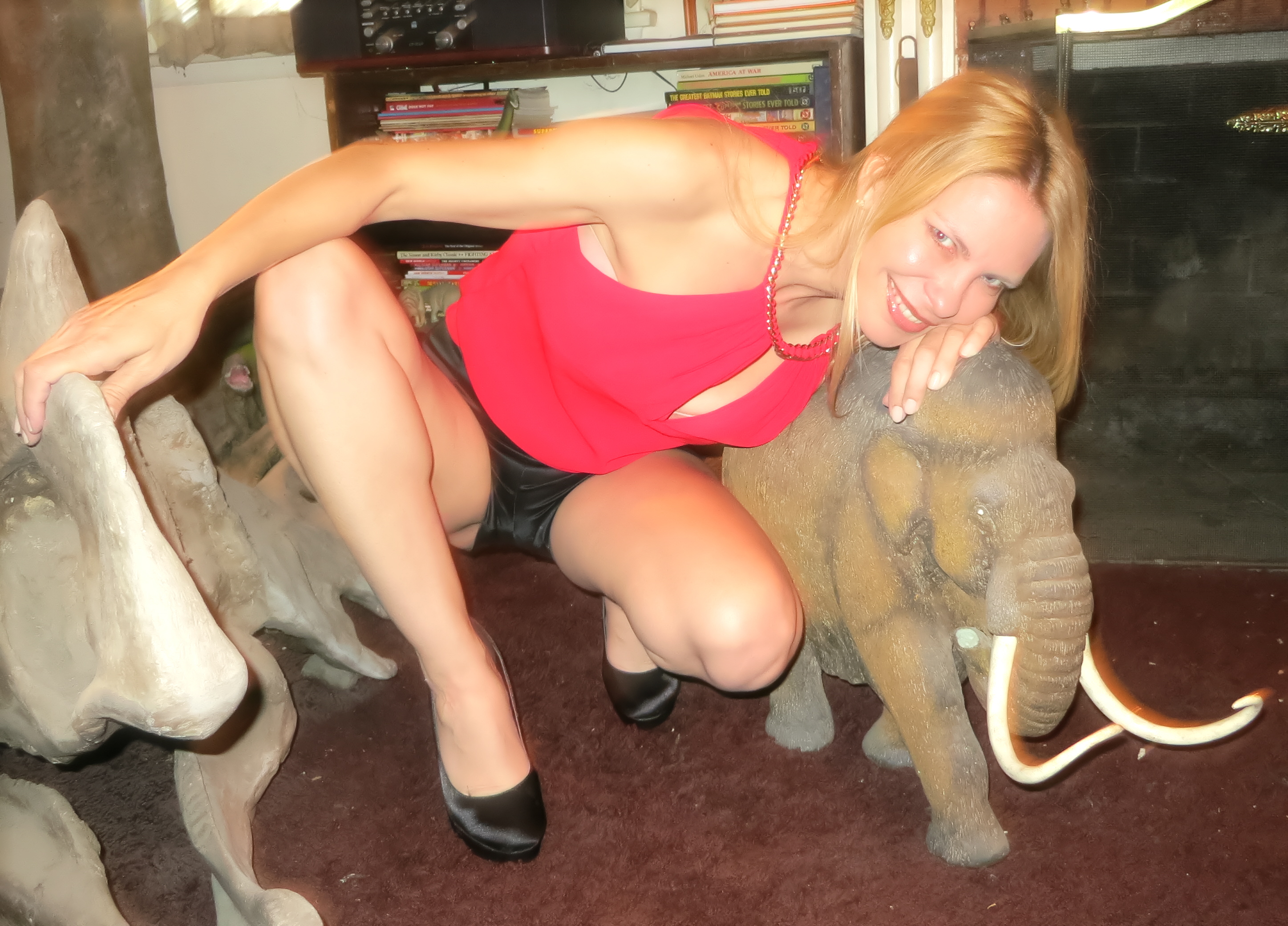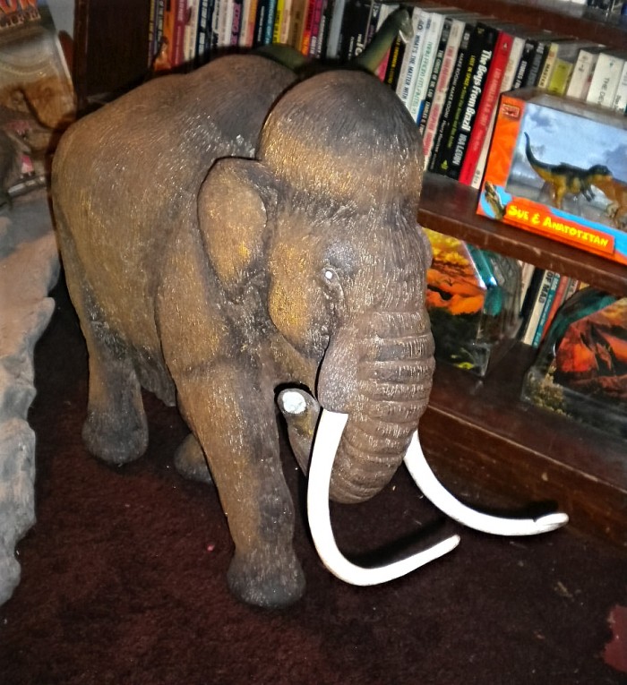 Woolly mammoth statue from Design Toscano, Elk Grove Village, IL. And below left, a souvenir postcard showing a life-sized mammoth statue at Prehistoric Parks in Drumheller, Alberta, Canada.