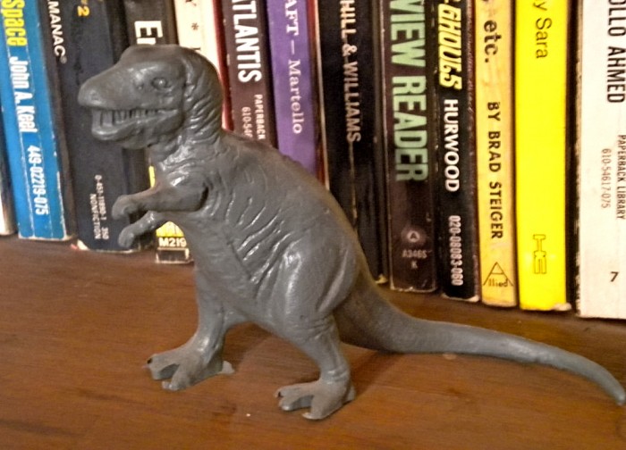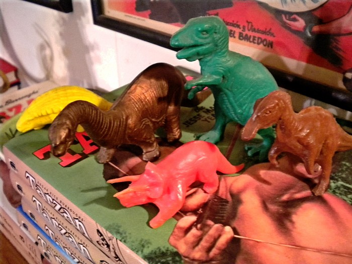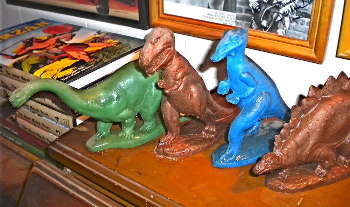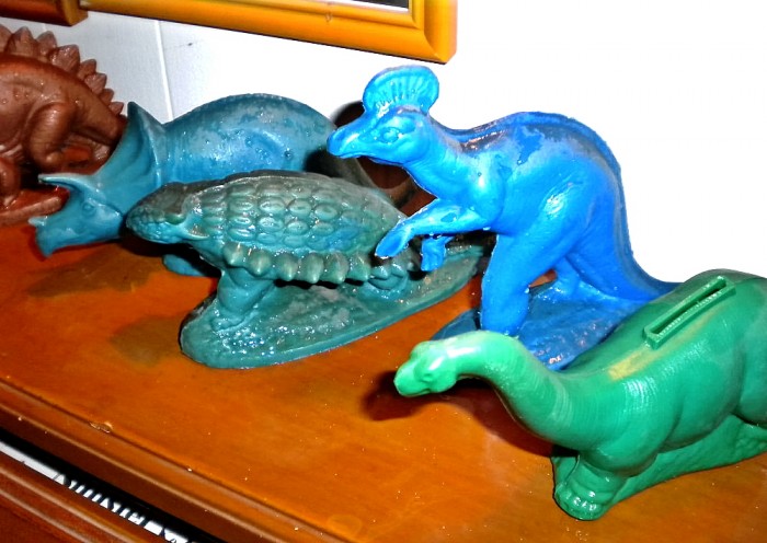 Injected-plastic dinosaurs based on the full-sized models made by the Jonas Studios for the “Sinclair Dinoland” exhibit, New York World’s Fair (1964). Most of these figures were made and sold in “Mold-a-Rama” vending machines, which can still be found today (e.g., The Field Museum in Chicago). Included in the second photo (above) is a Sinclair bank (ca. mid-1960). Also (below), set of plastic toy dinosaurs (1960s) based on the full-scale statues made for the 1964 Fair. The gray Tyrannosaurus is a reissue.