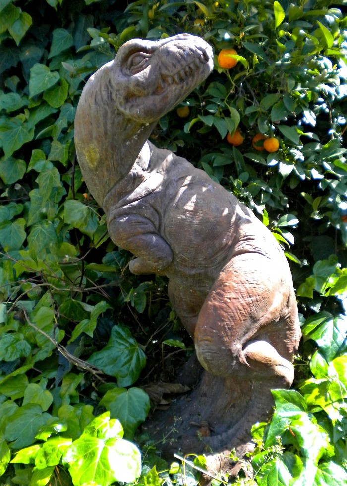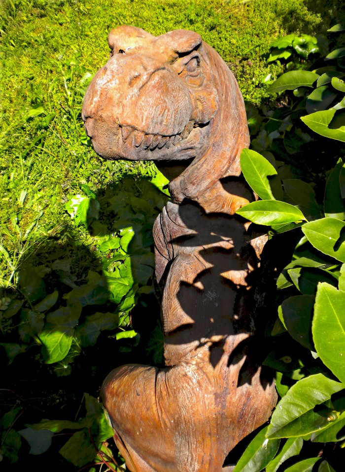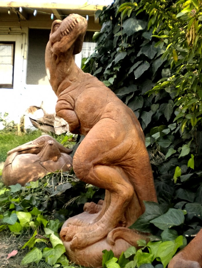 Juvenile or subadult theropod dinosaur (presumably a Tyrannosaurus) made of cement.
